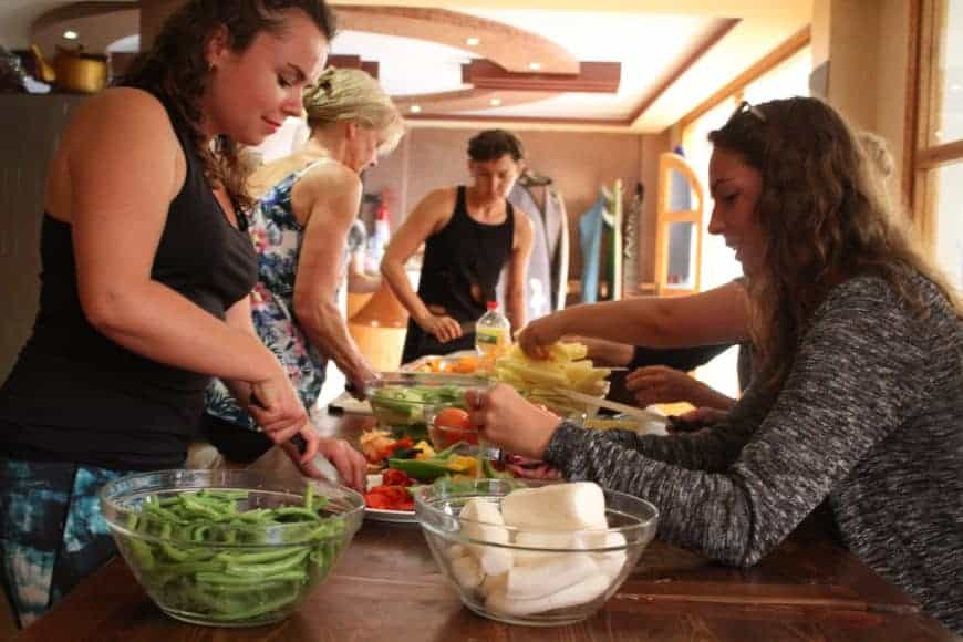 Morgens frühstücken wir alle zusammen um etwa 9 Uhr. Wir nutzen die Gelegenheit, um es zu sagen: Wir essen hier gut. Eine einfache und gemütliche Küche, die der Brandung angepasst ist. Die Motiviertesten werden früher aufgestanden sein, um um 8.15 Uhr an einer morgendlichen Yogastunde teilzunehmen.